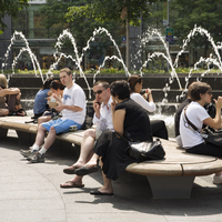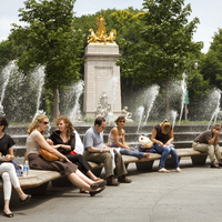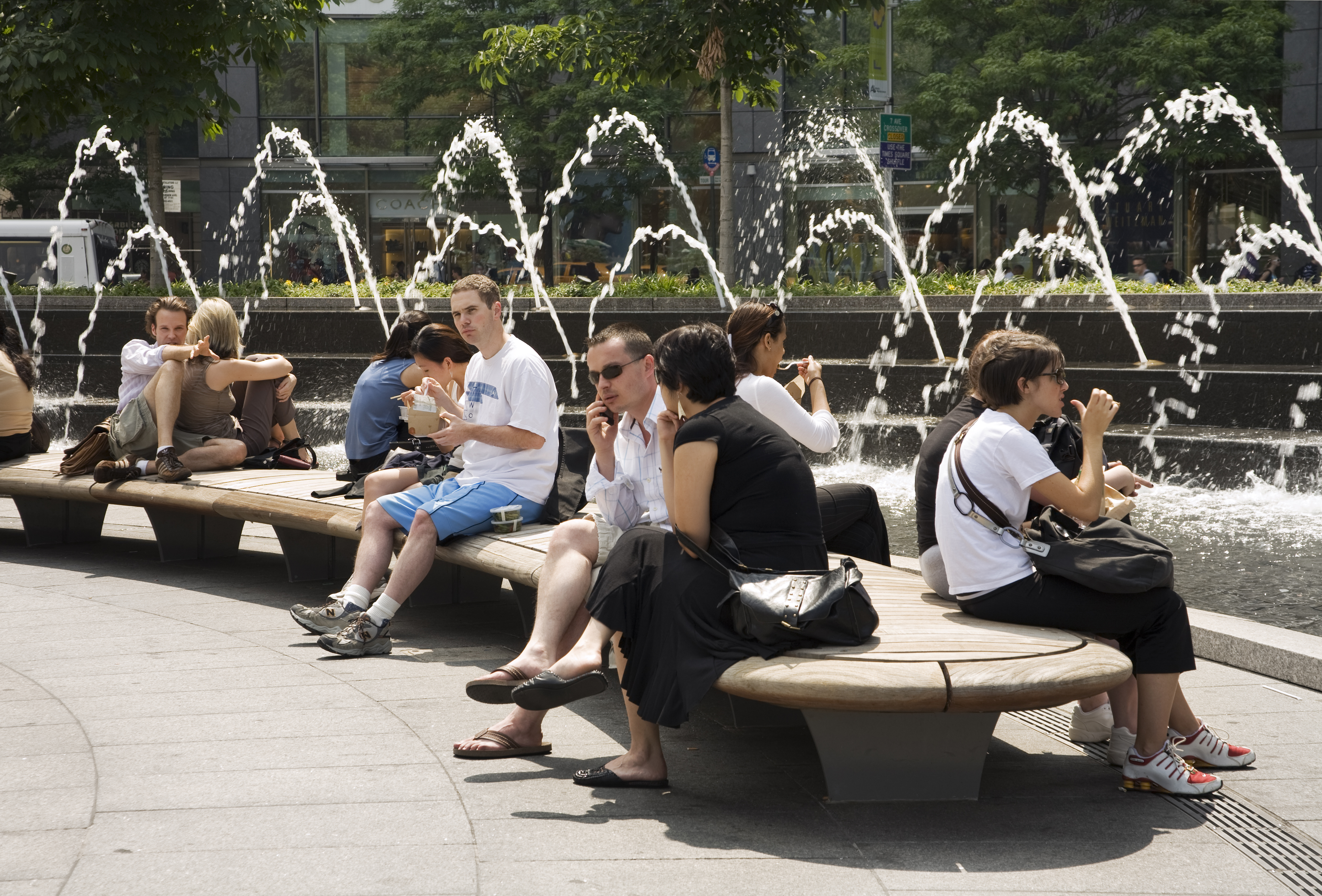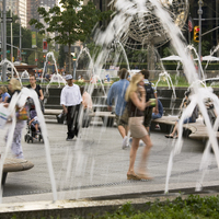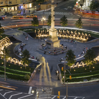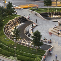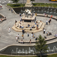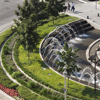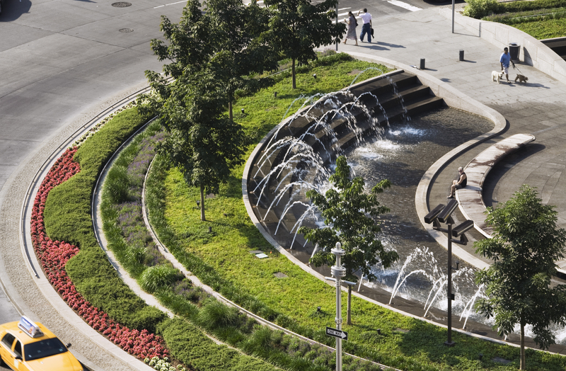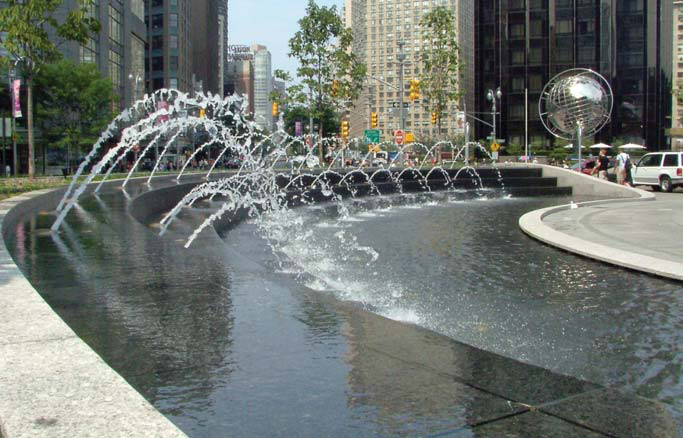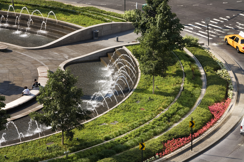 Columbus Circle Public Plaza redesigned the historic traffic circle on the southwest corner of New York City’s Central Park to ease traffic congestion and create a new park. Plagued in the past by traffic bottlenecks, the circle now offers organized and safe traffic flow and a small park that is a destination of its own. Indeed, the circle is a safe haven in a busy intersection. A walkable fountain encircles the park and helps muffle the sound of traffic, and a ring of benches and gardens add to the plaza’s welcome. A 225,000-square-foot transportation hub beneath the circle accommodates subway transit at a major transfer station, and the 40-foot-high marble monument to Christopher Columbus now towers over the public in a new context that enhances the plaza’s thriving atmosphere.