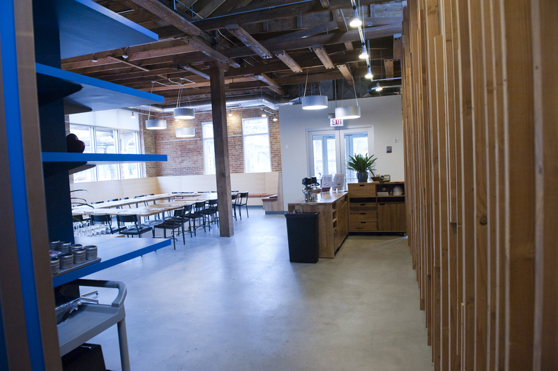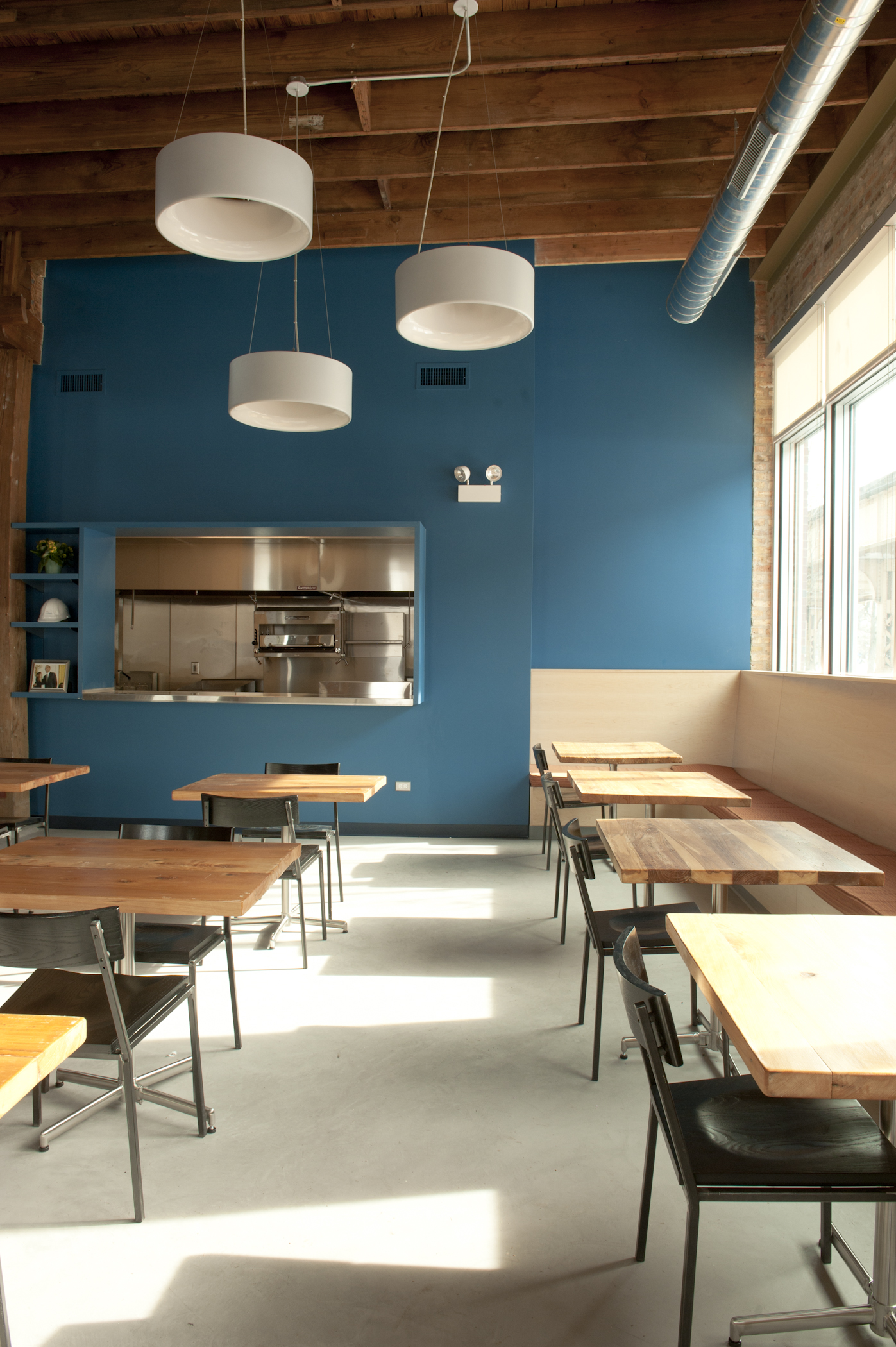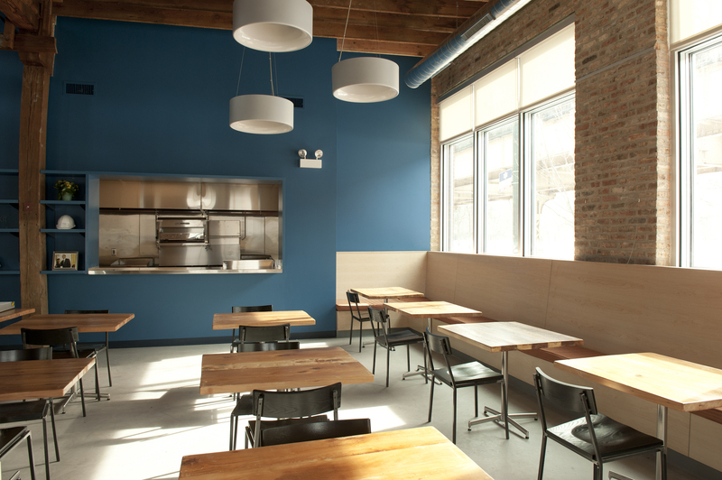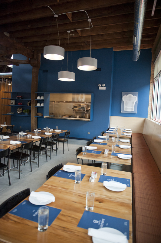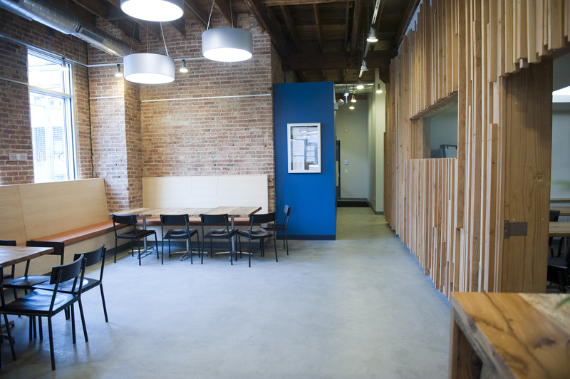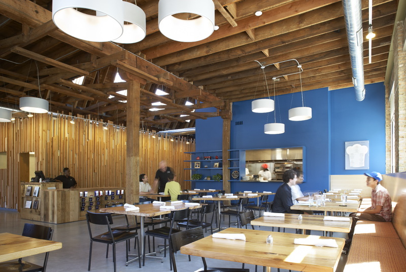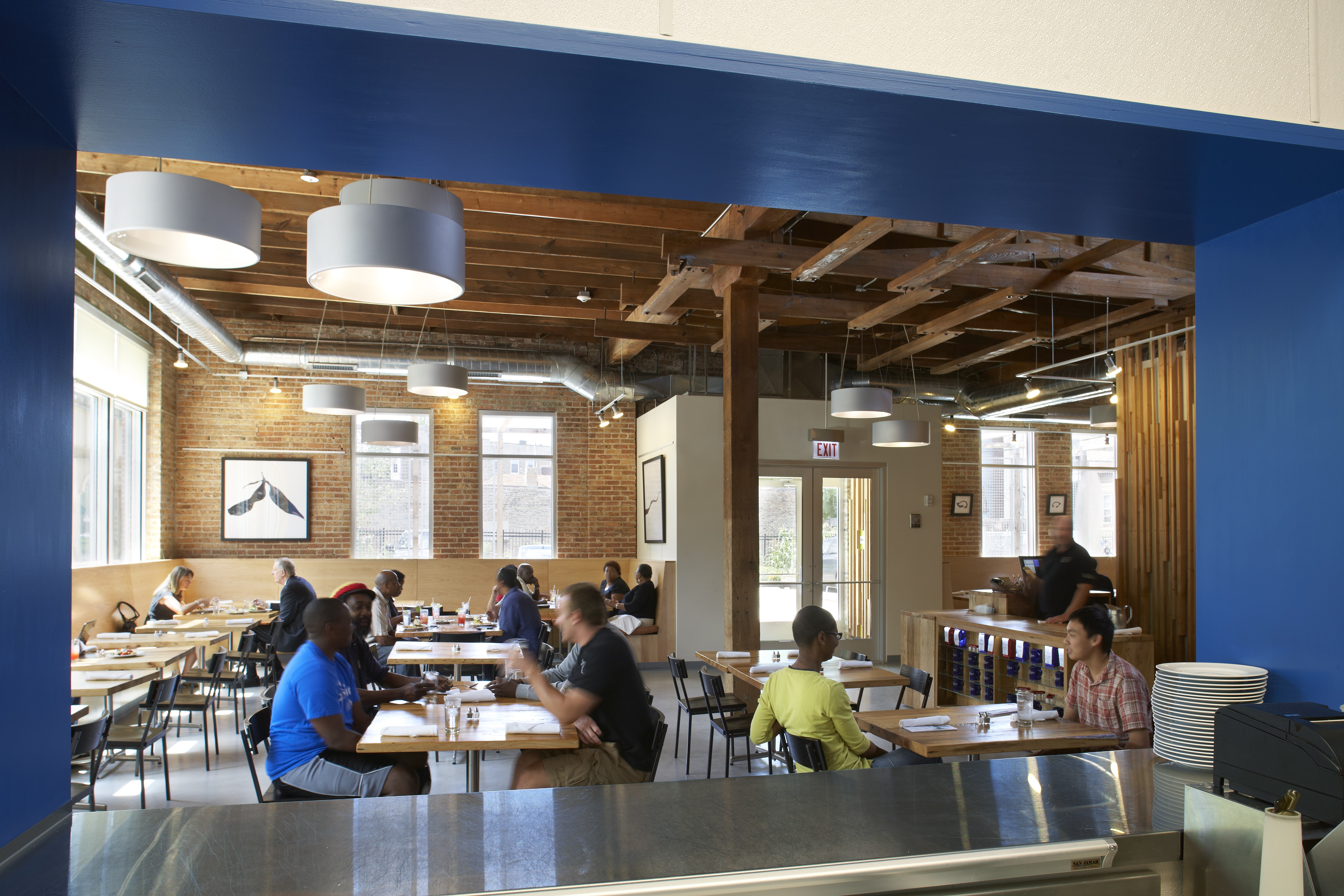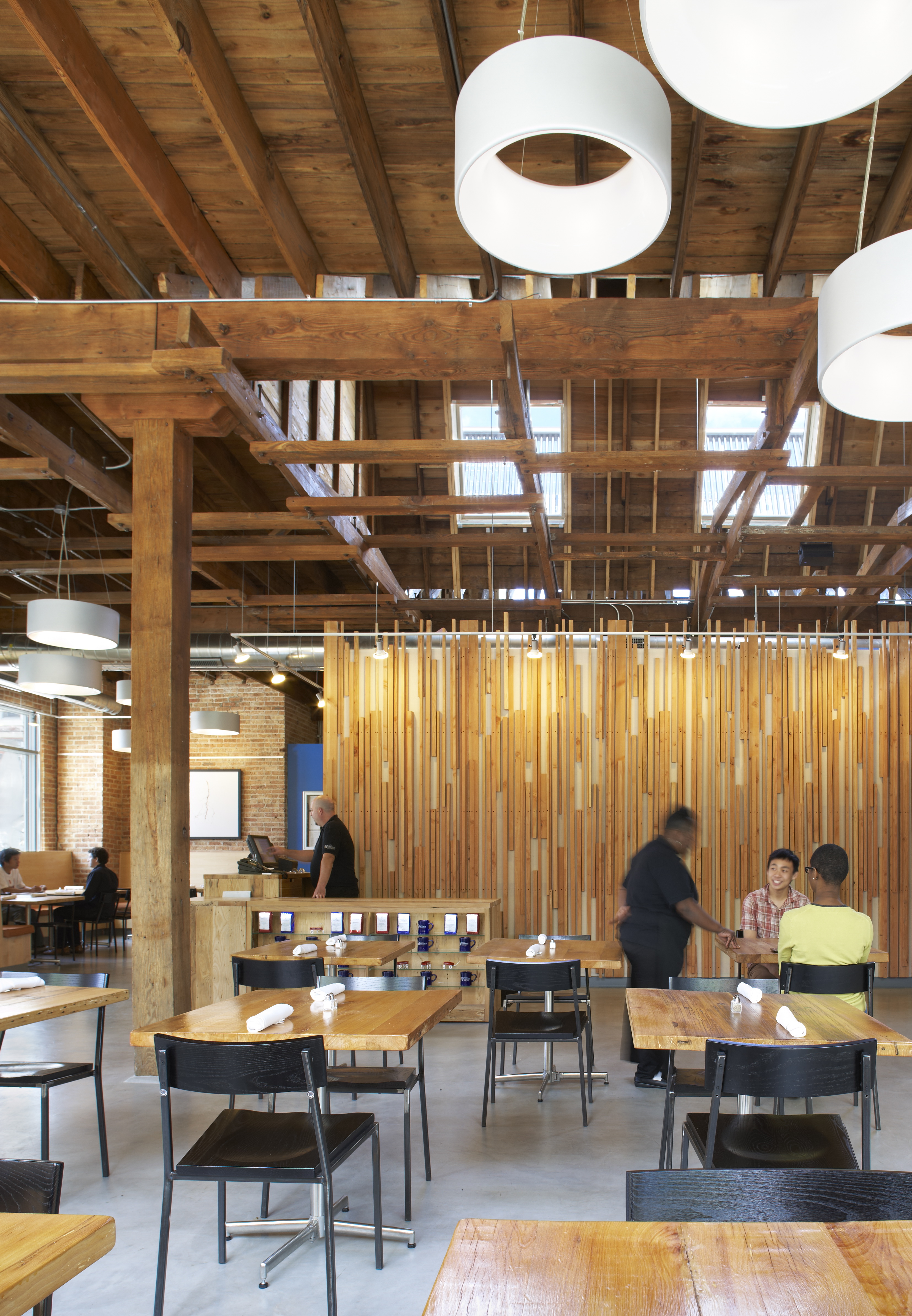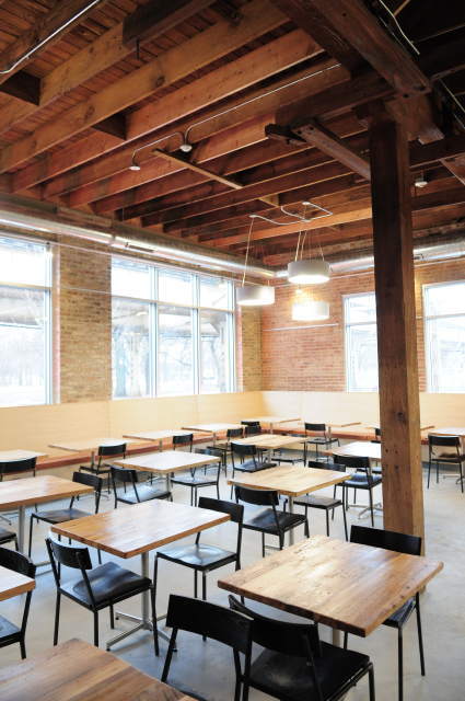 The restaurant, kitchen, and offices are housed in a 7,315-square-foot former factory next to an elevated rail station. The design features a light and airy interior and employs a wide range of energy-efficient elements, including a solar thermal hot water system. A large front window connects diners to the street, and a garden onsite and nearby community garden provide fresh produce for meals.