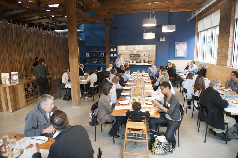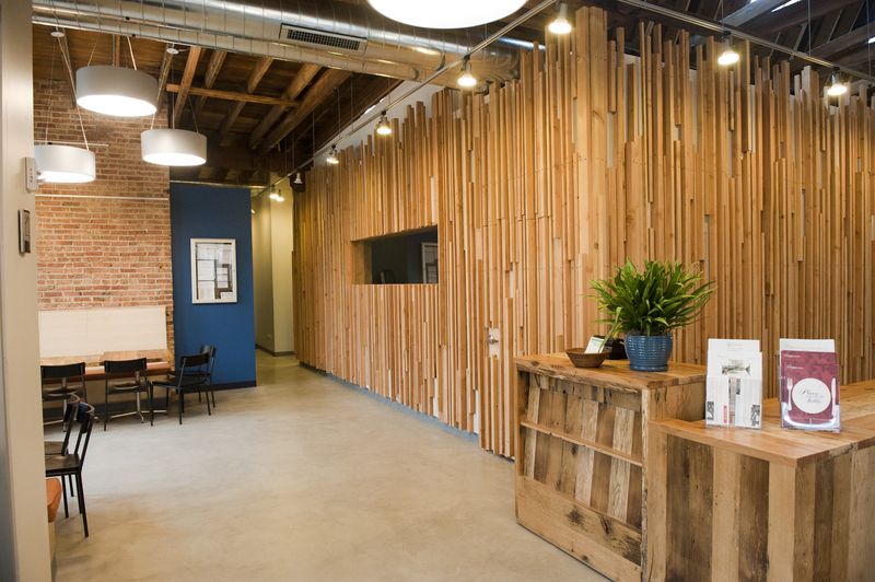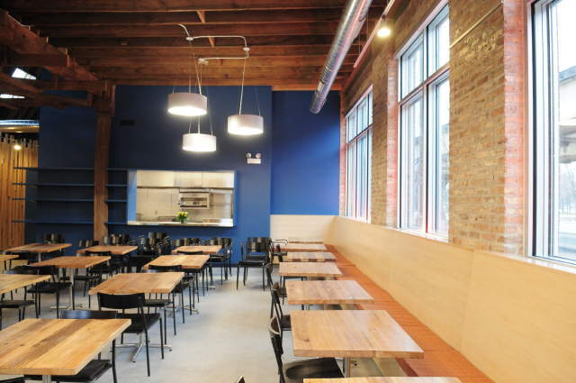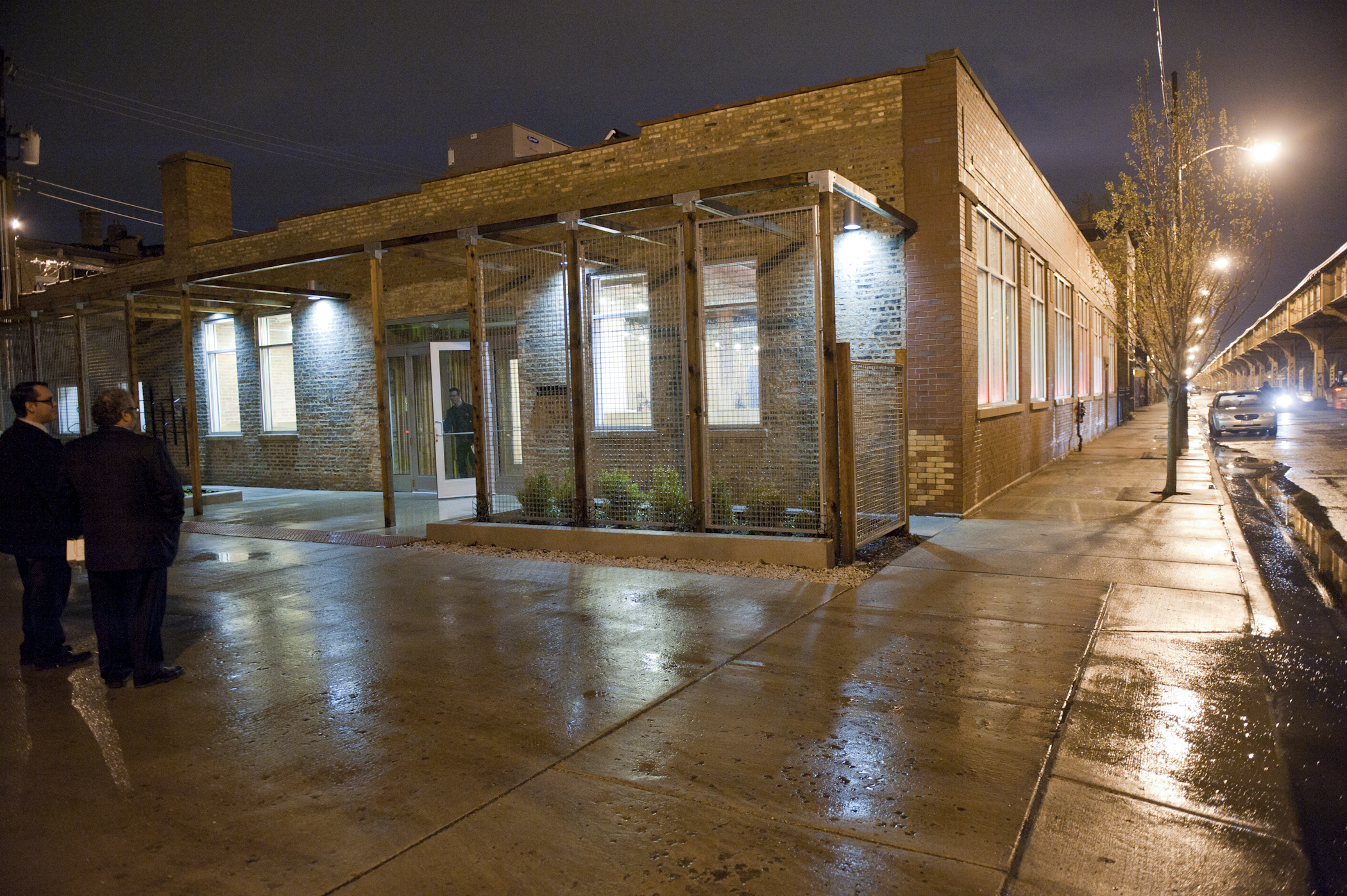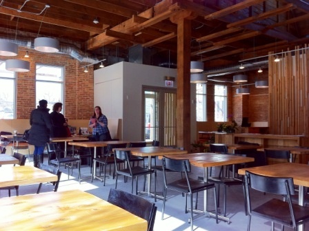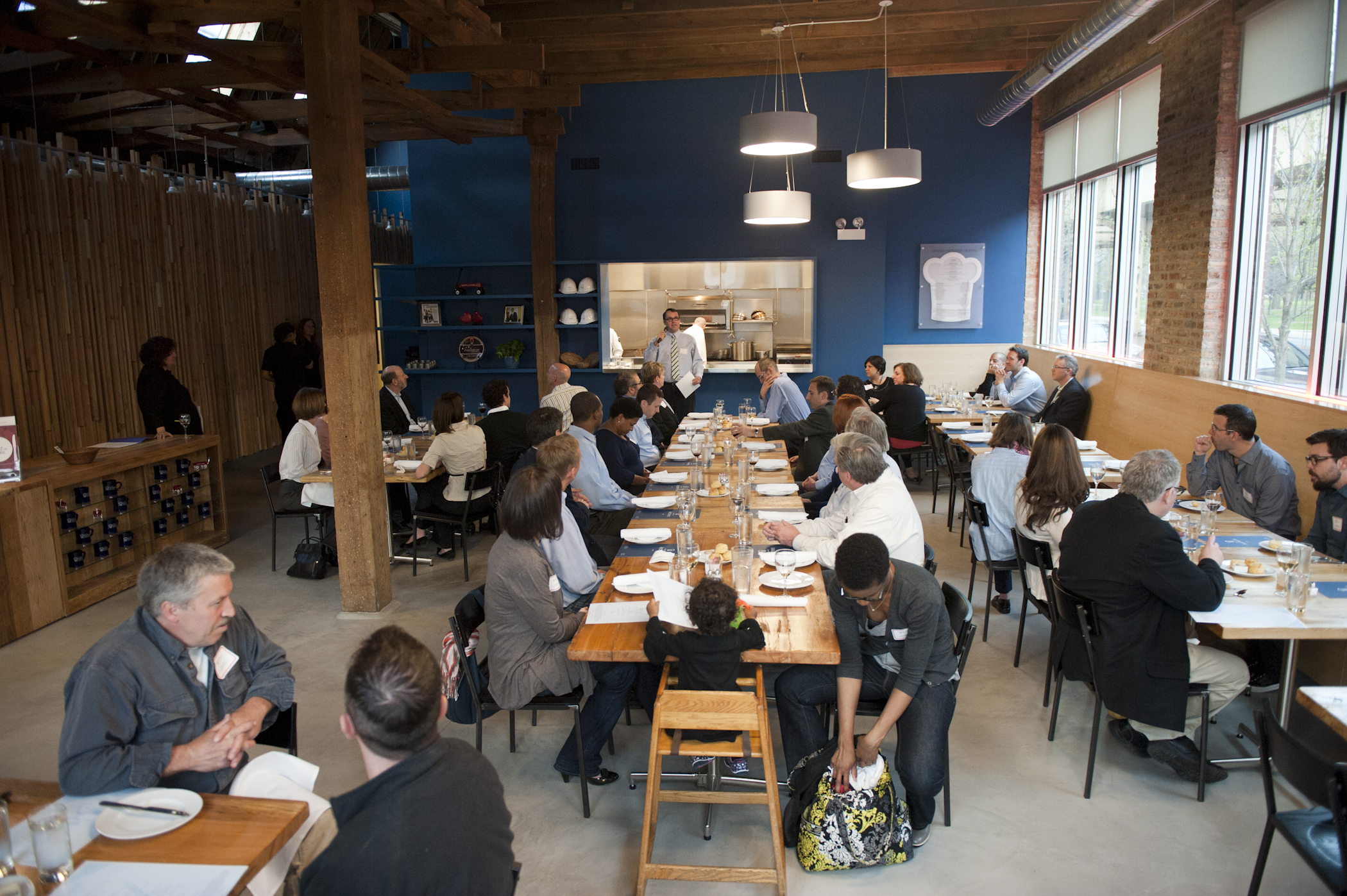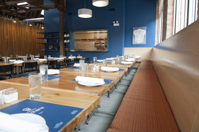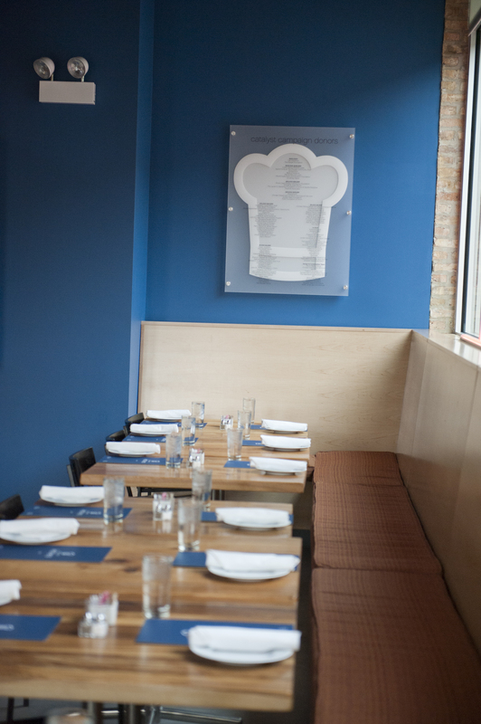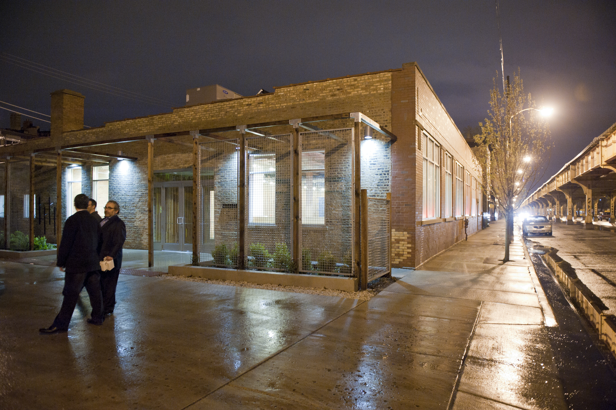 The restaurant, kitchen, and offices are housed in a 7,315-square-foot former factory next to an elevated rail station. The design features a light and airy interior and employs a wide range of energy-efficient elements, including a solar thermal hot water system. A large front window connects diners to the street, and a garden onsite and nearby community garden provide fresh produce for meals.