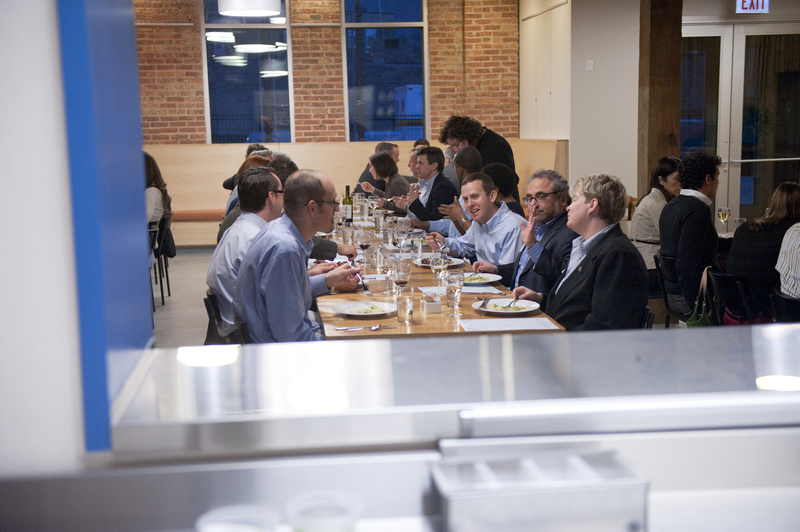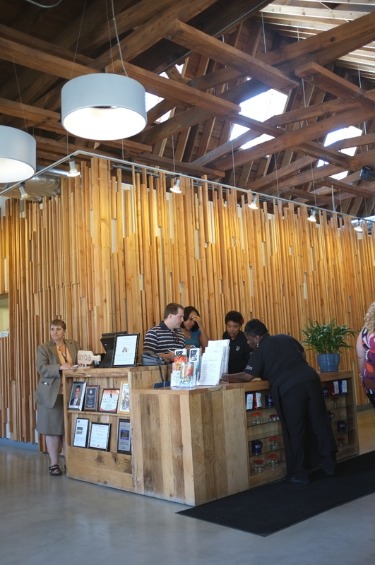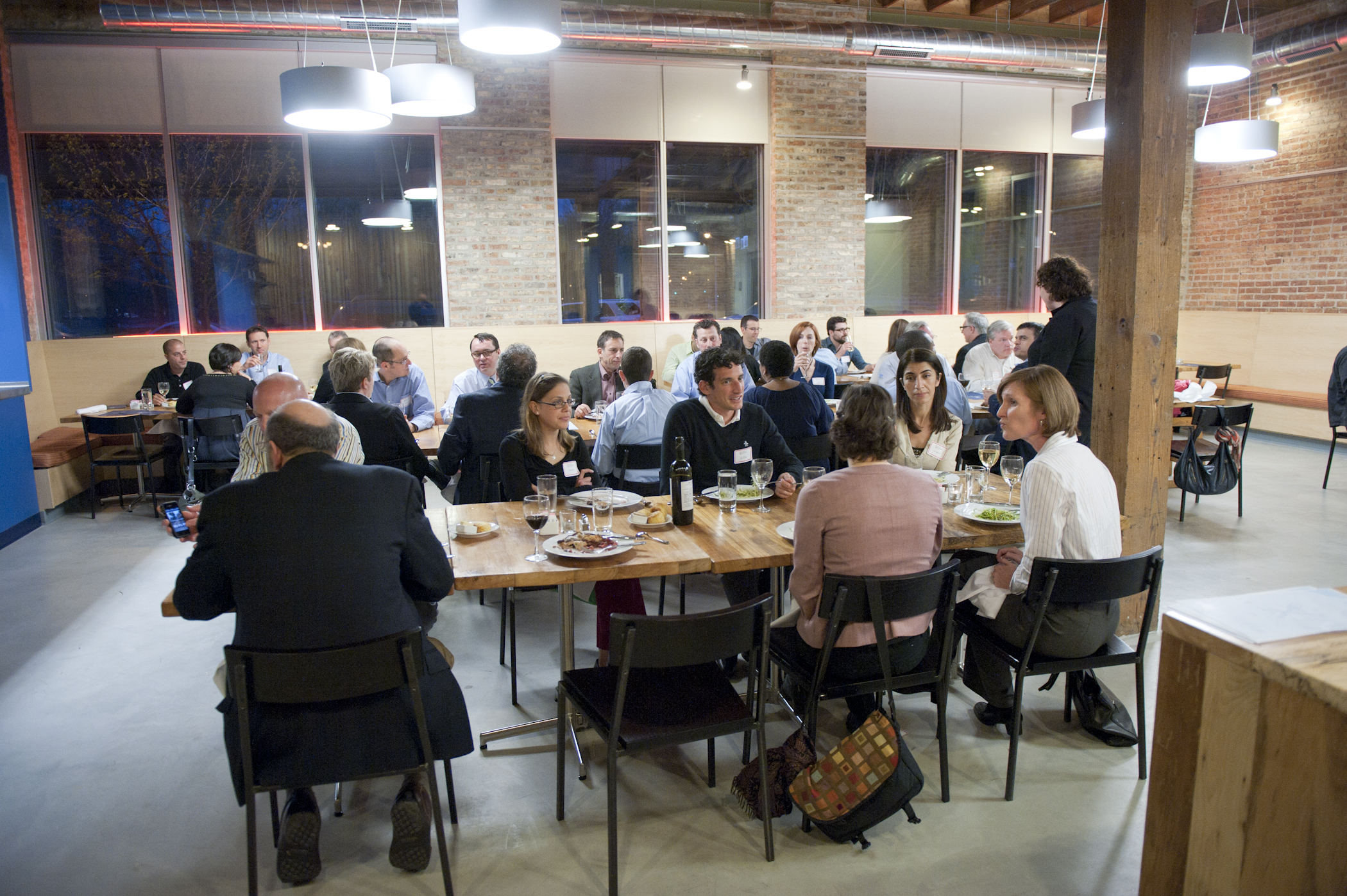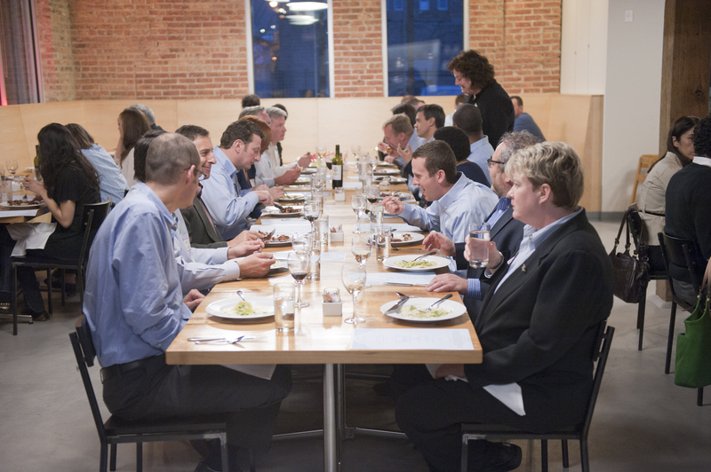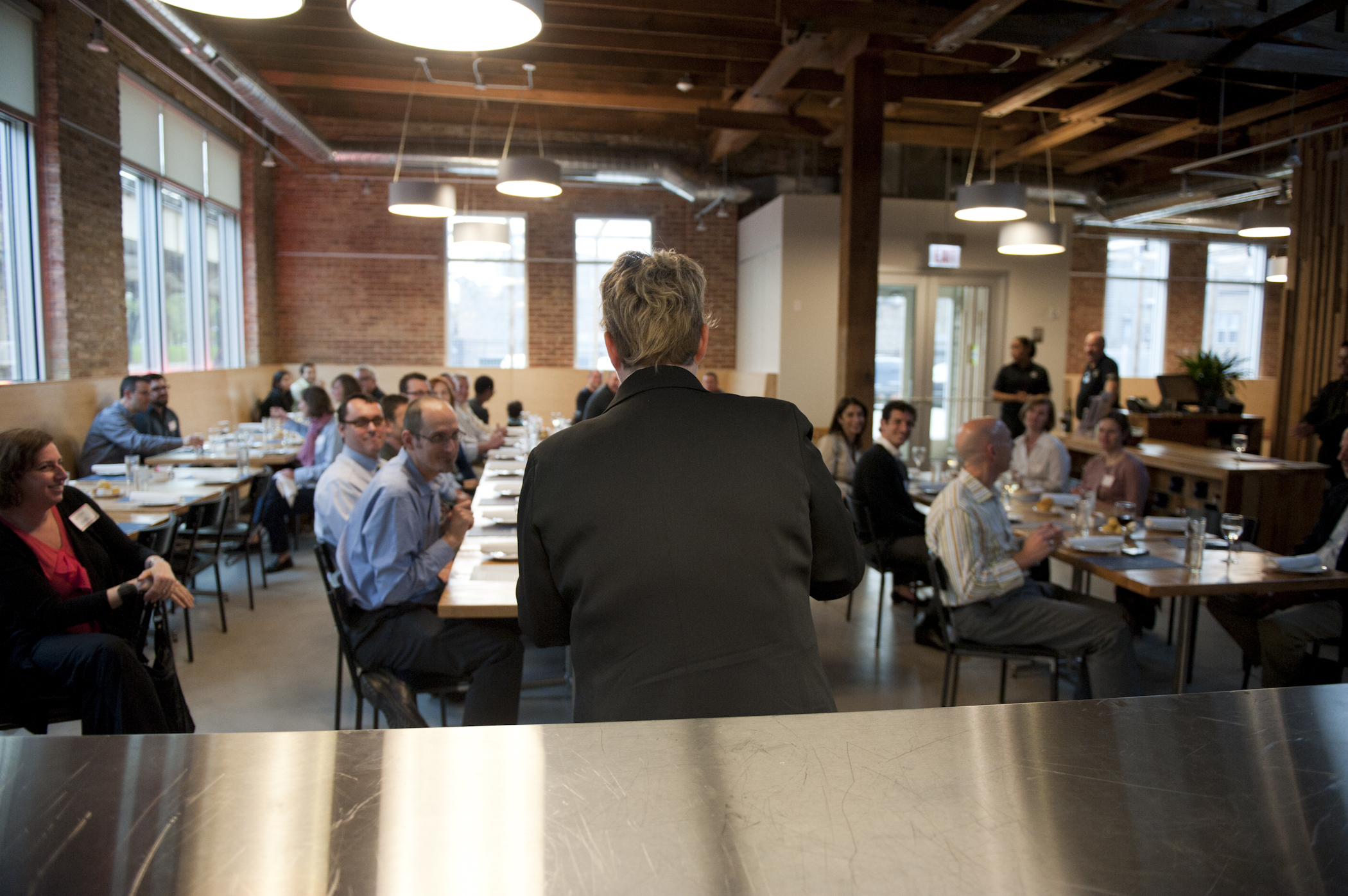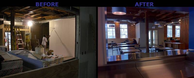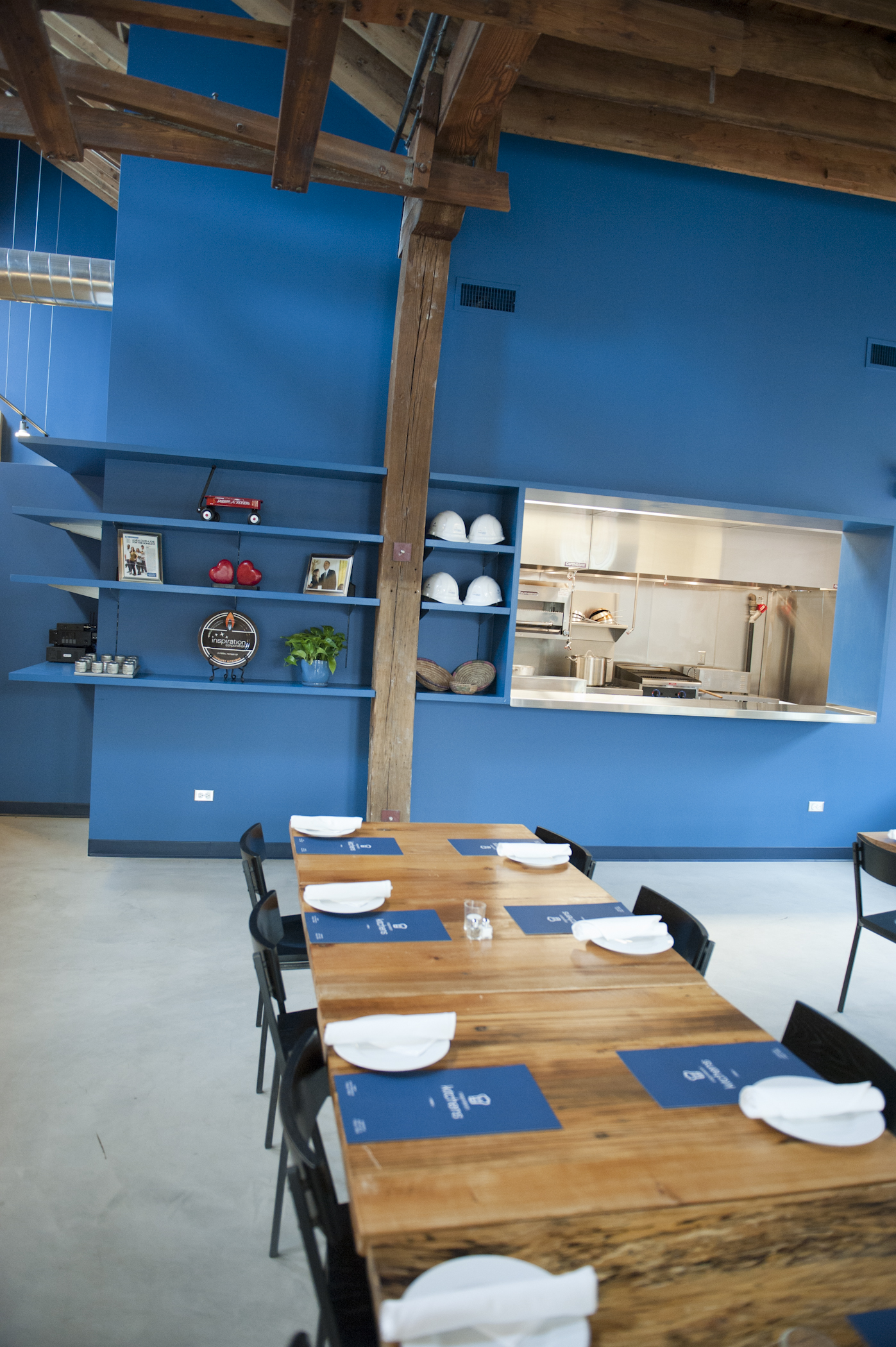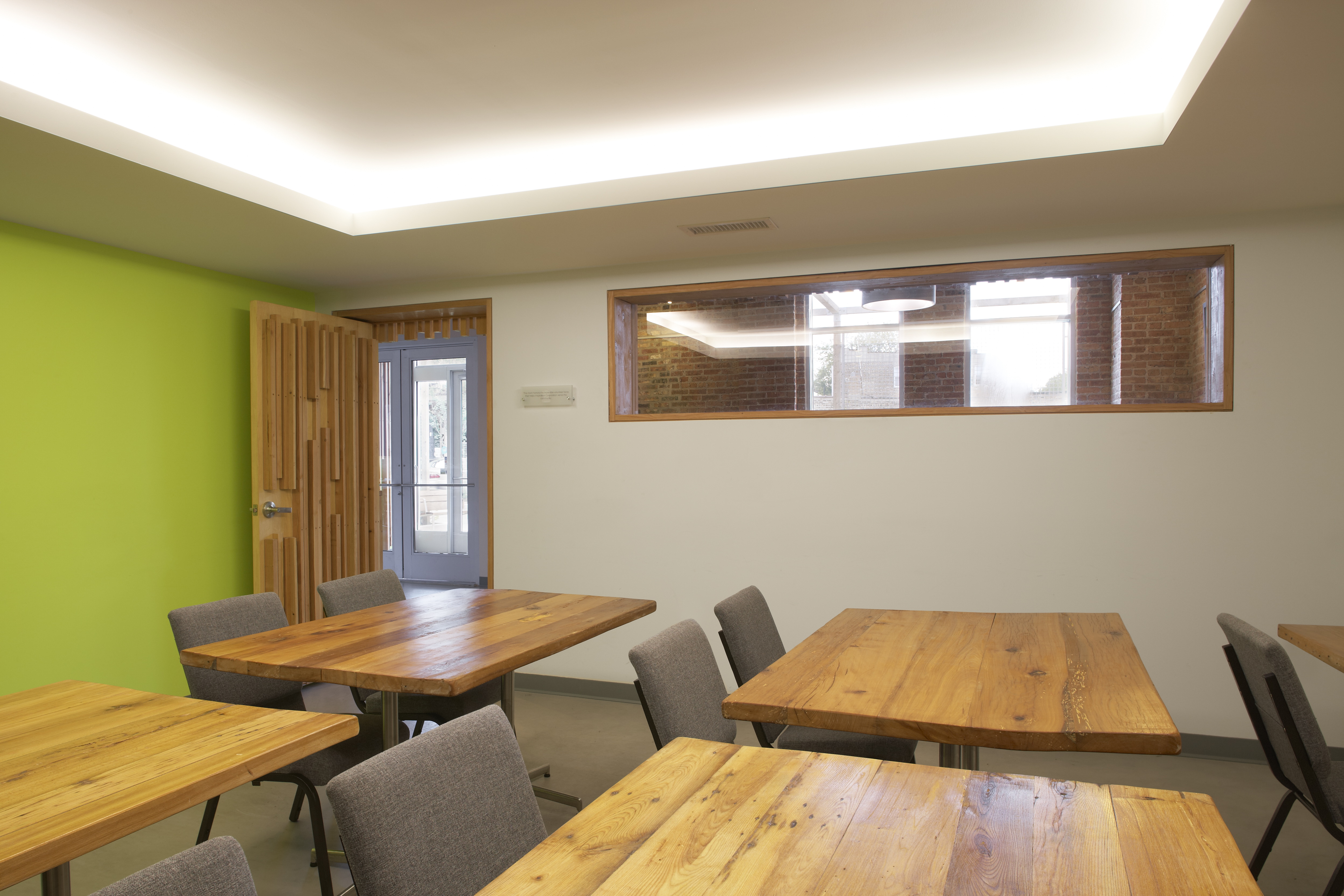 The restaurant, kitchen, and offices are housed in a 7,315-square-foot former factory next to an elevated rail station. The design features a light and airy interior and employs a wide range of energy-efficient elements, including a solar thermal hot water system. A large front window connects diners to the street, and a garden onsite and nearby community garden provide fresh produce for meals.
