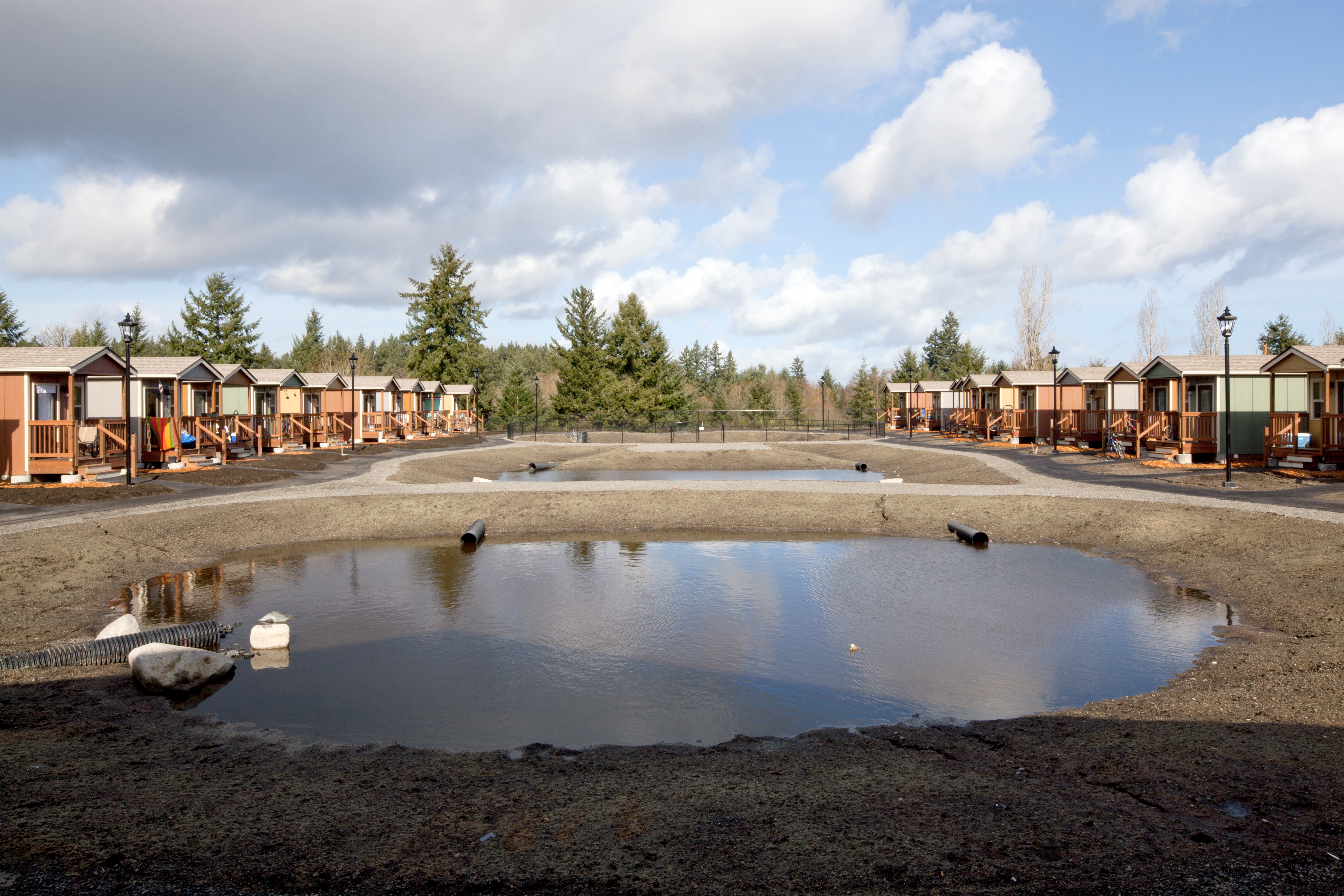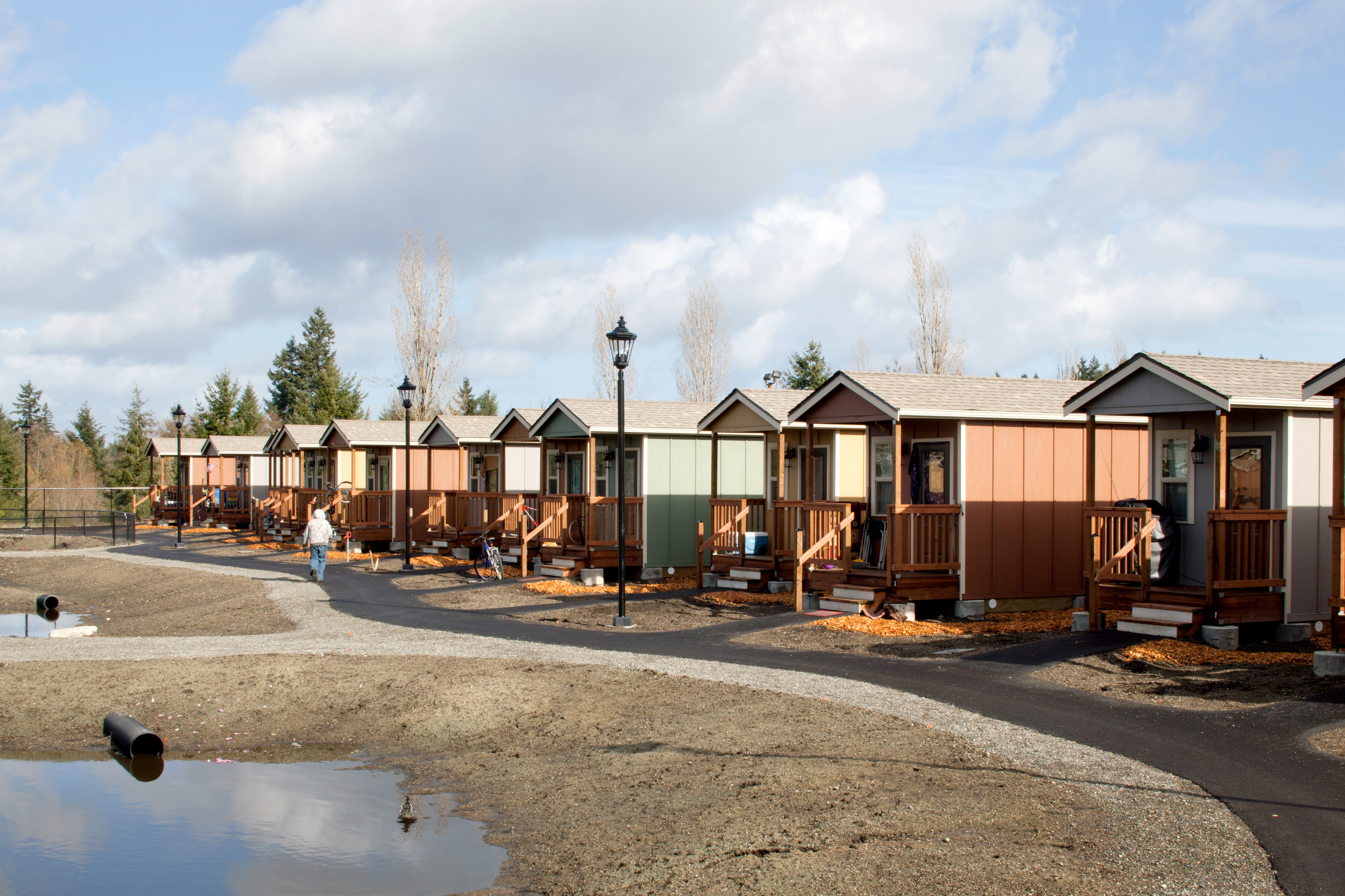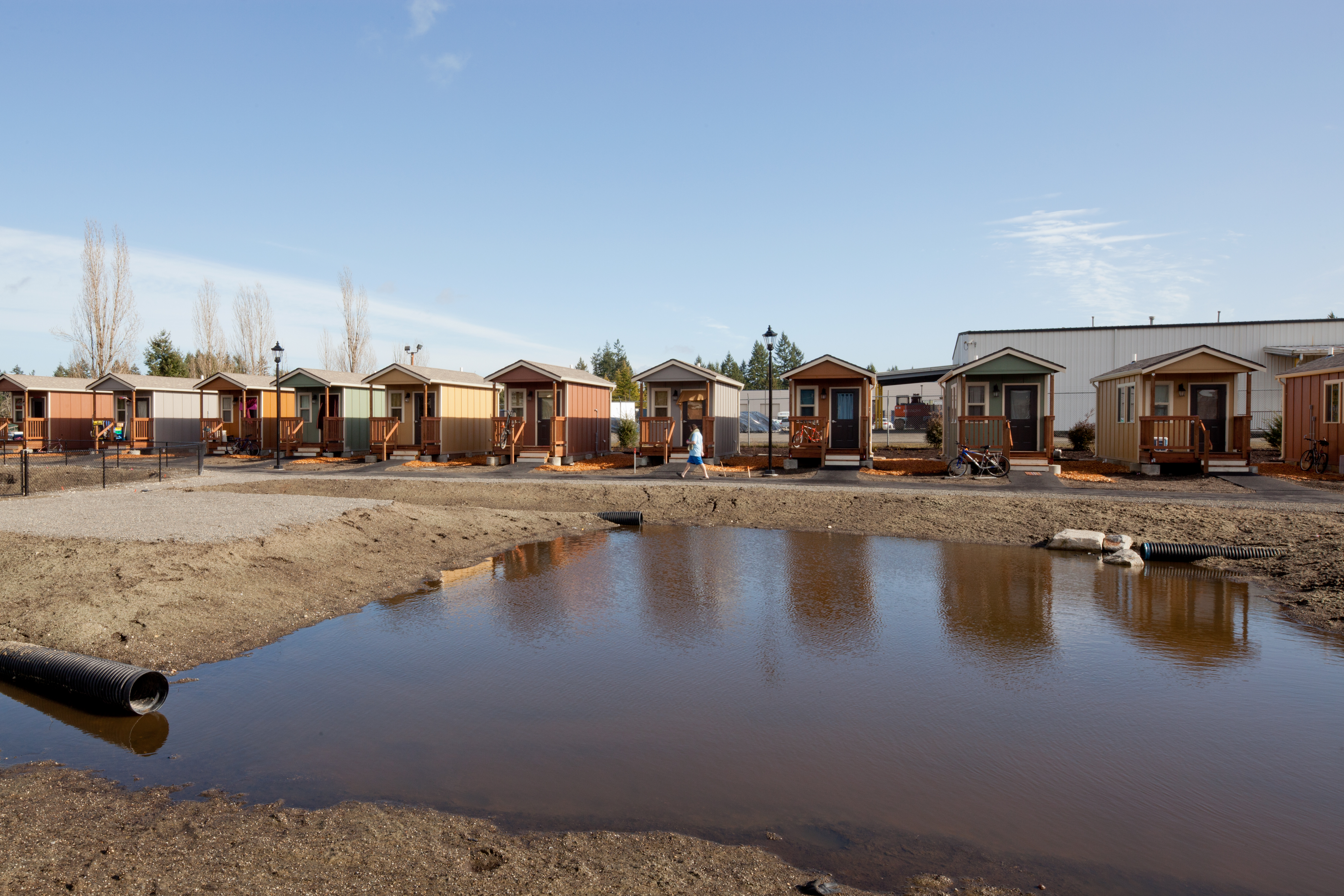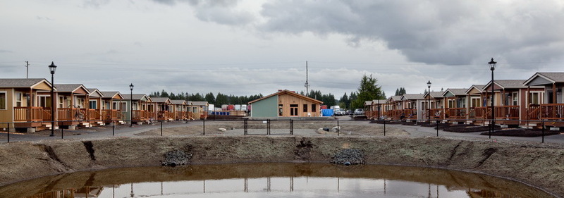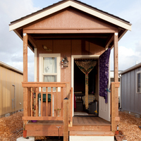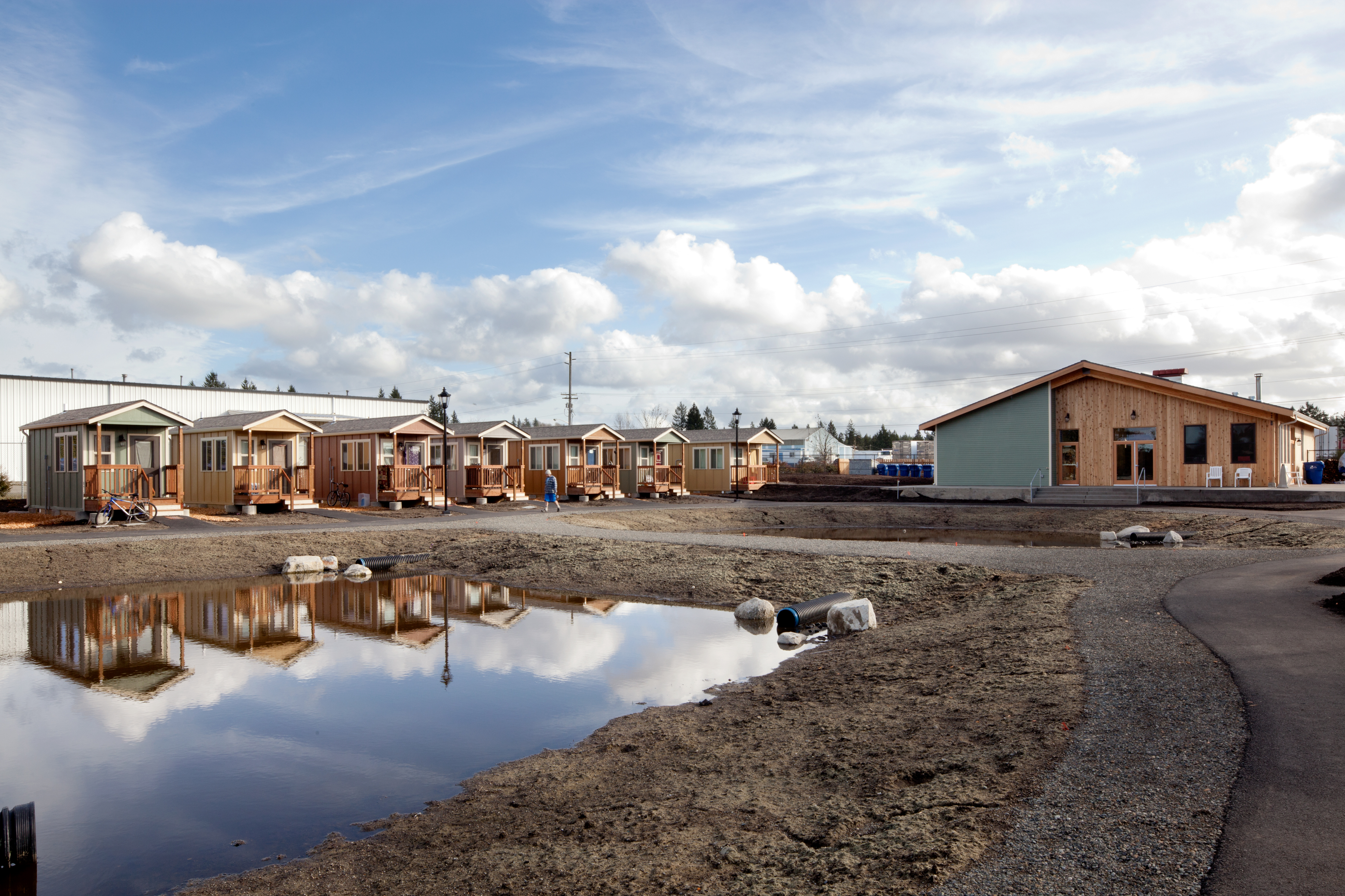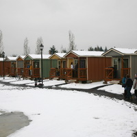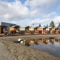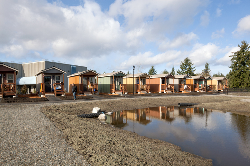 Quixote Village in Olympia, Washington, is a low-cost, sustainable community composed of 30 tiny houses occupied by formerly homeless residents. Set on two acres of land donated by the county, the cottages face a central open space and retention ponds, and a 2,640-square-foot community building houses a communal kitchen and gathering room, showers and laundry facilities, staff offices, and a meeting room. Each 144-square-foot house provides just enough room for a single bed, a desk and chair, a half bath, and a closet. Front porches encourage interaction and contribute to the sense of community.