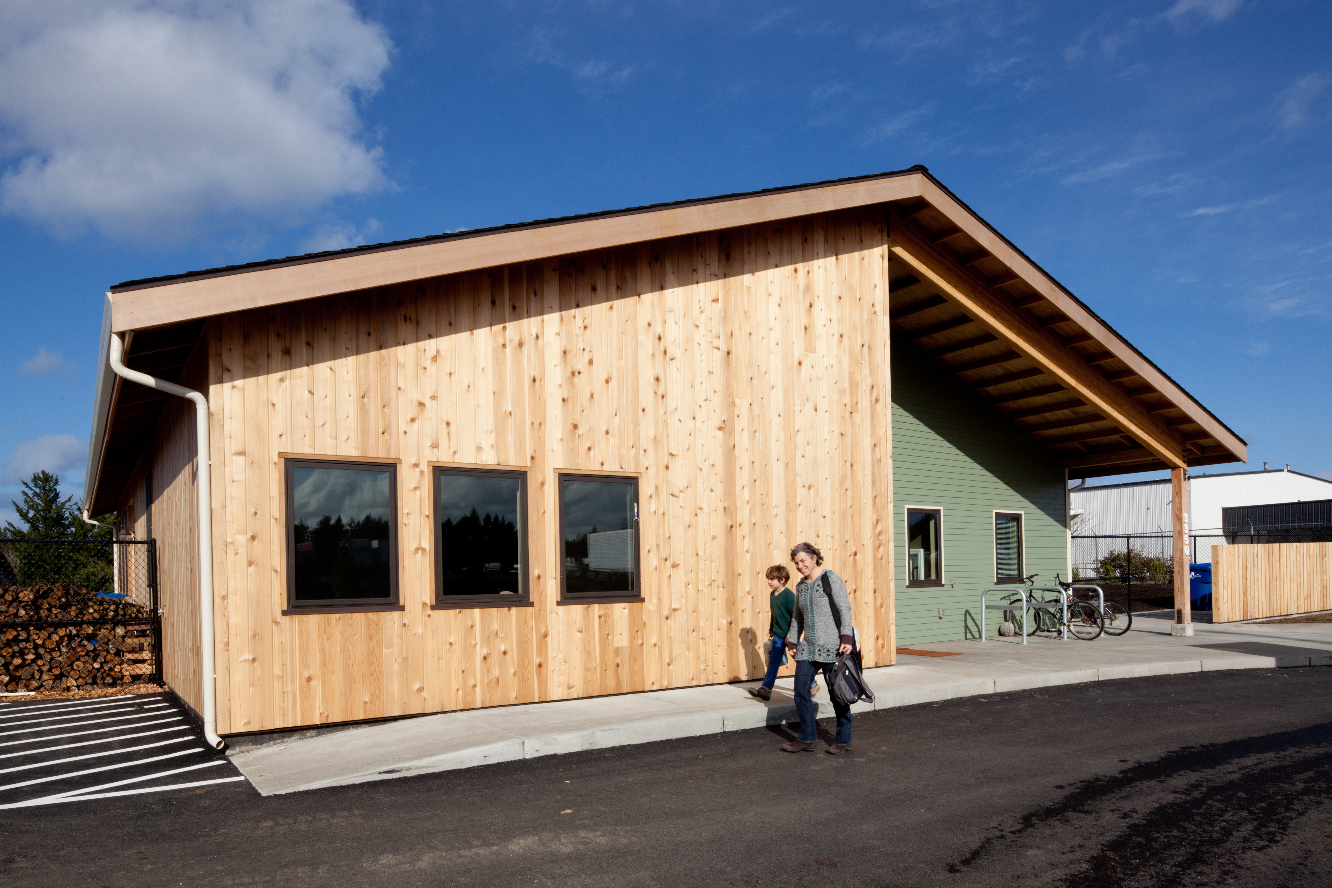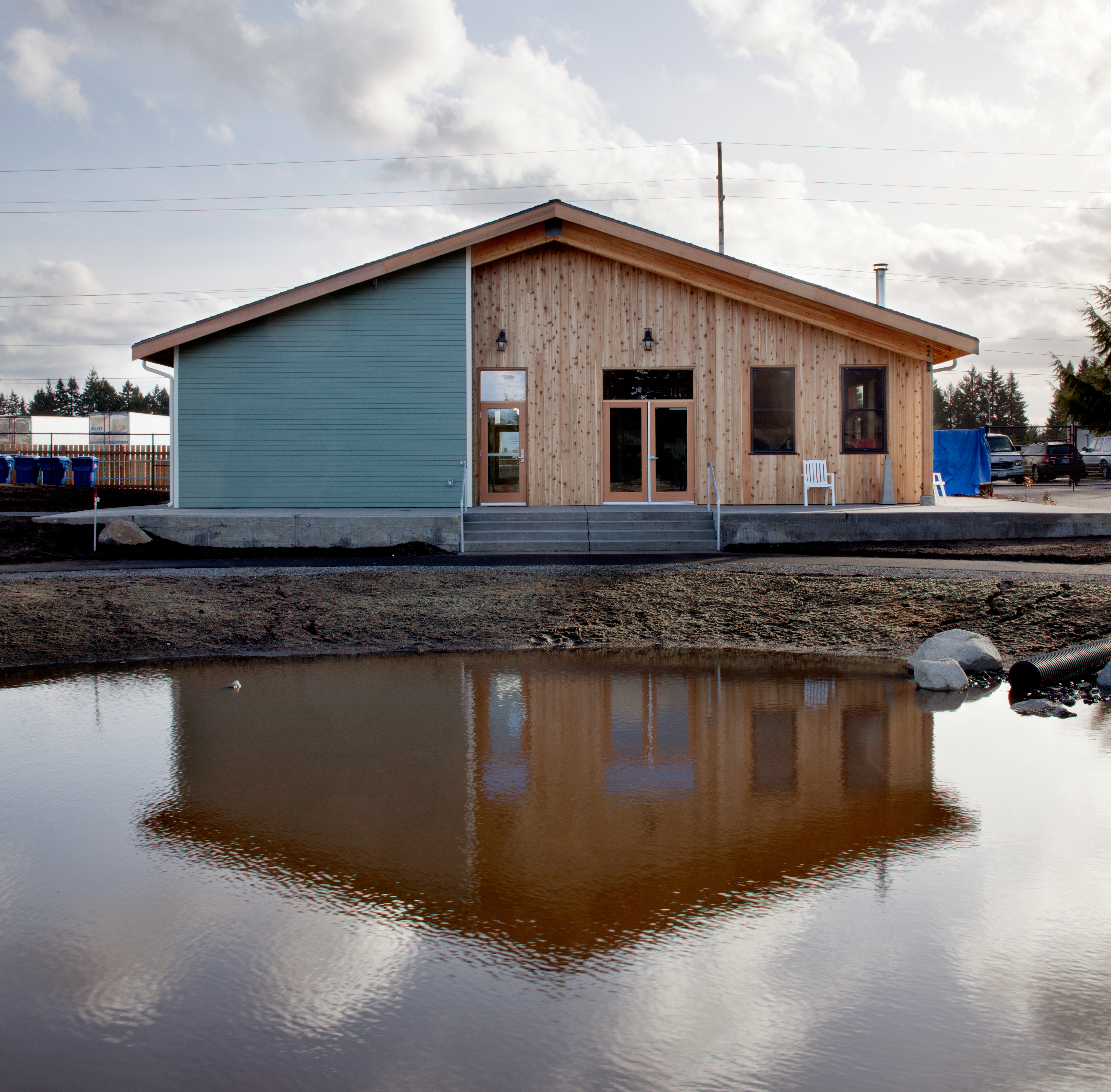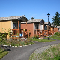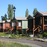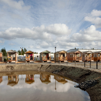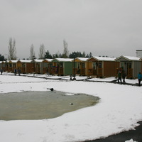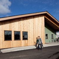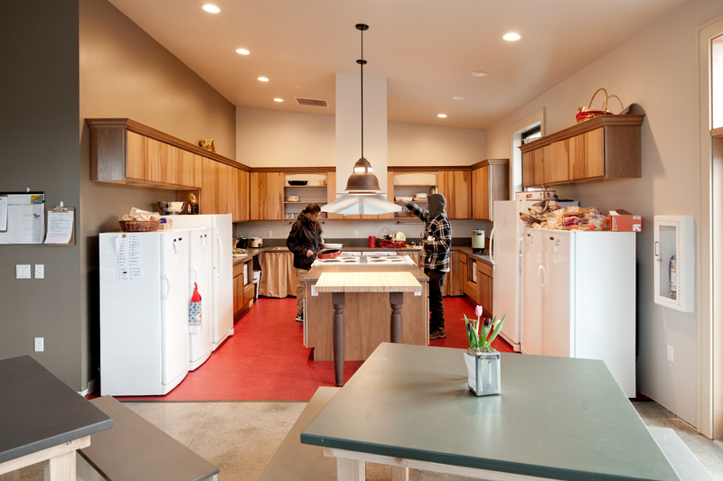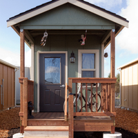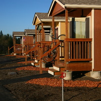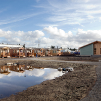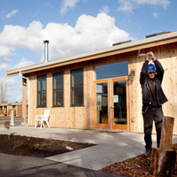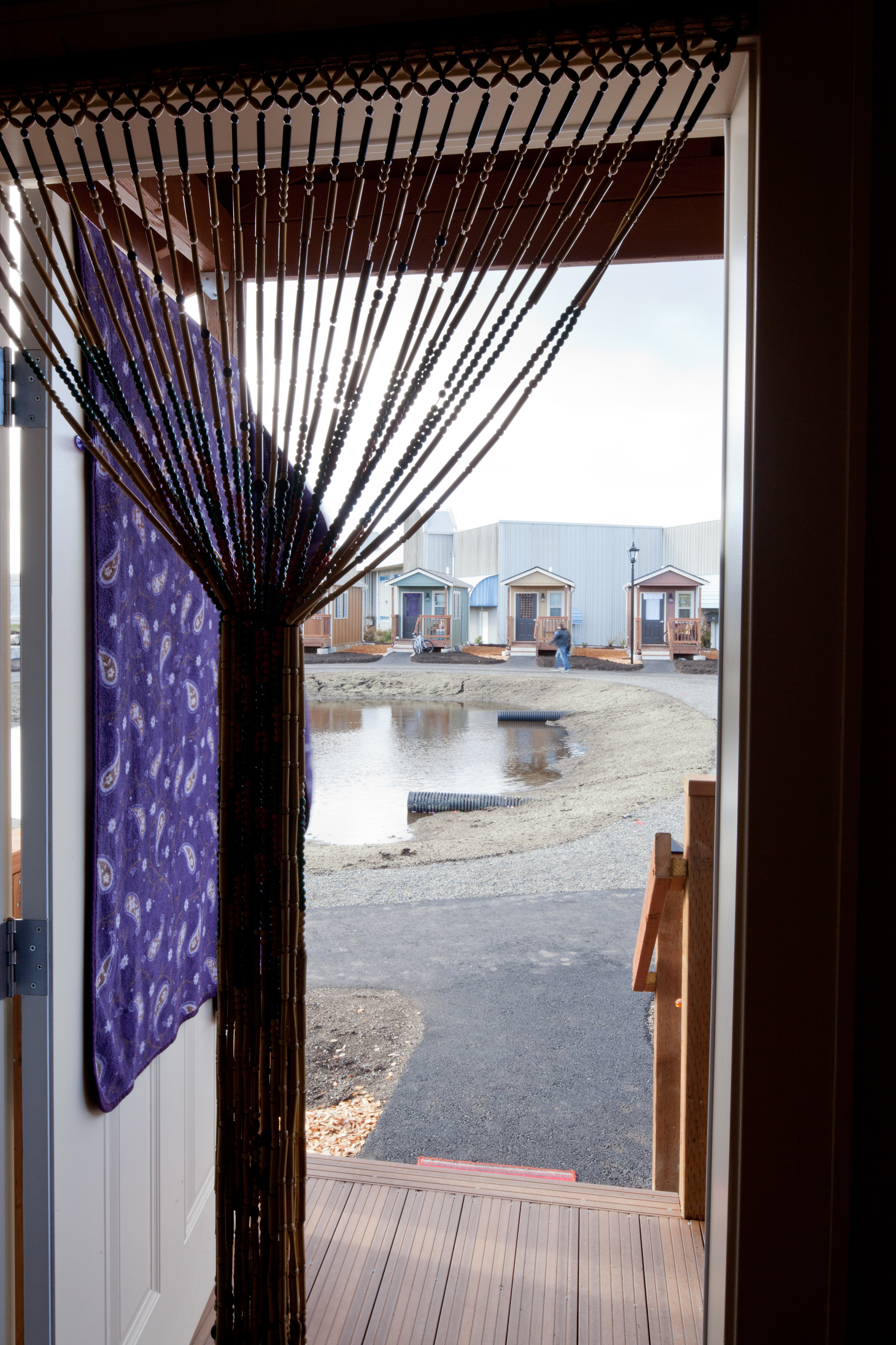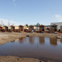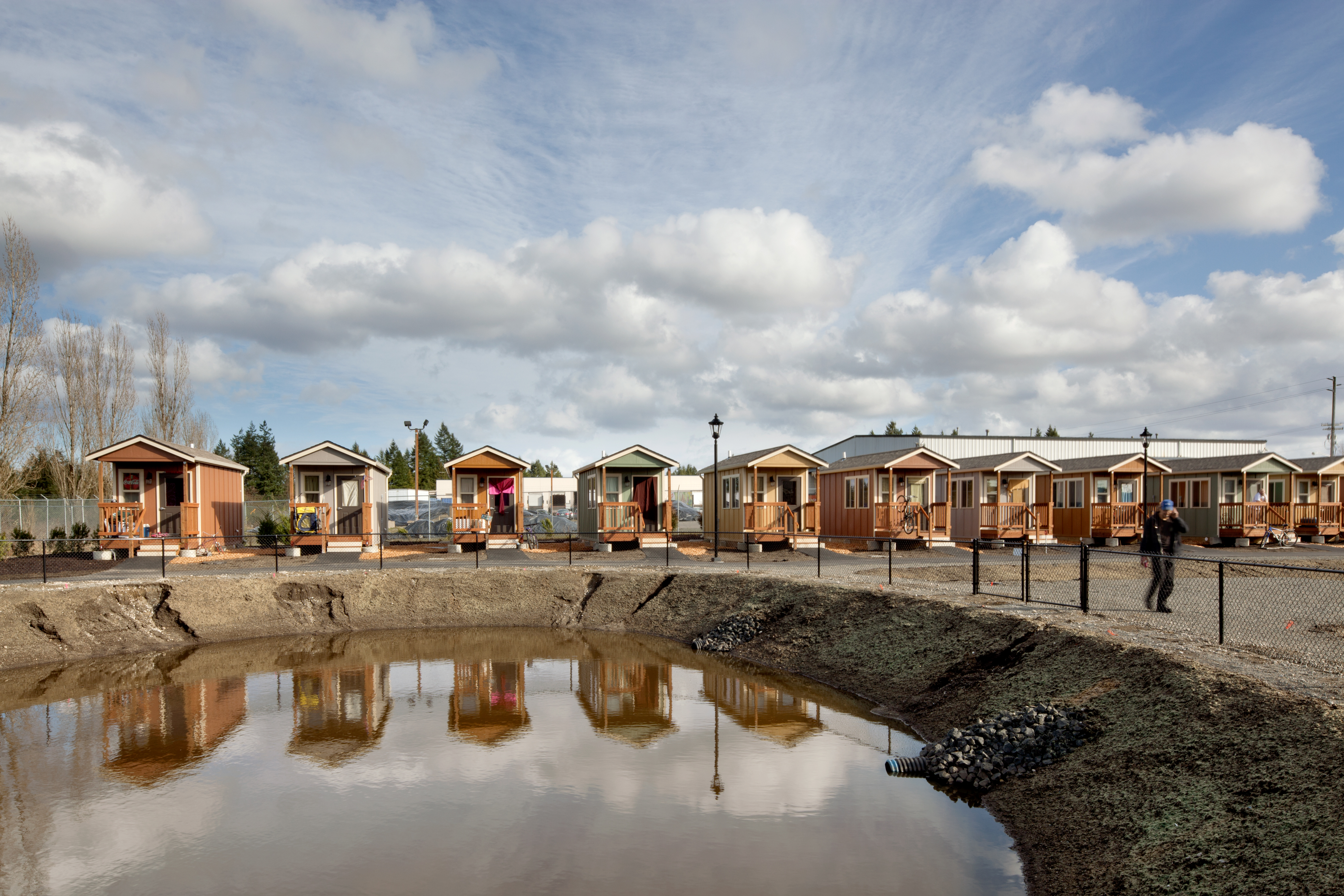 Quixote Village in Olympia, Washington, is a low-cost, sustainable community composed of 30 tiny houses occupied by formerly homeless residents. Set on two acres of land donated by the county, the cottages face a central open space and retention ponds, and a 2,640-square-foot community building houses a communal kitchen and gathering room, showers and laundry facilities, staff offices, and a meeting room. Each 144-square-foot house provides just enough room for a single bed, a desk and chair, a half bath, and a closet. Front porches encourage interaction and contribute to the sense of community.