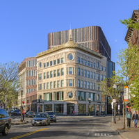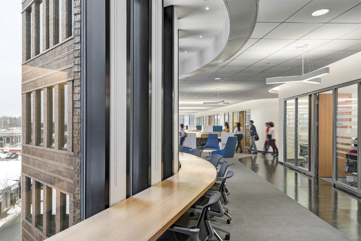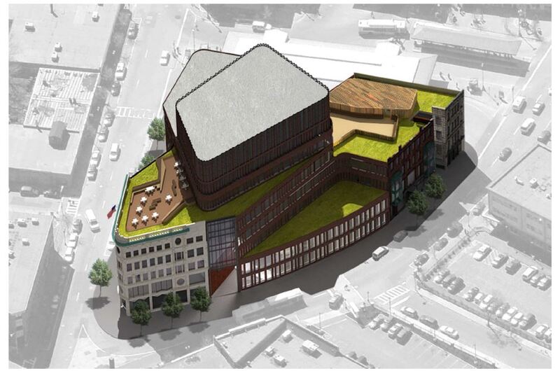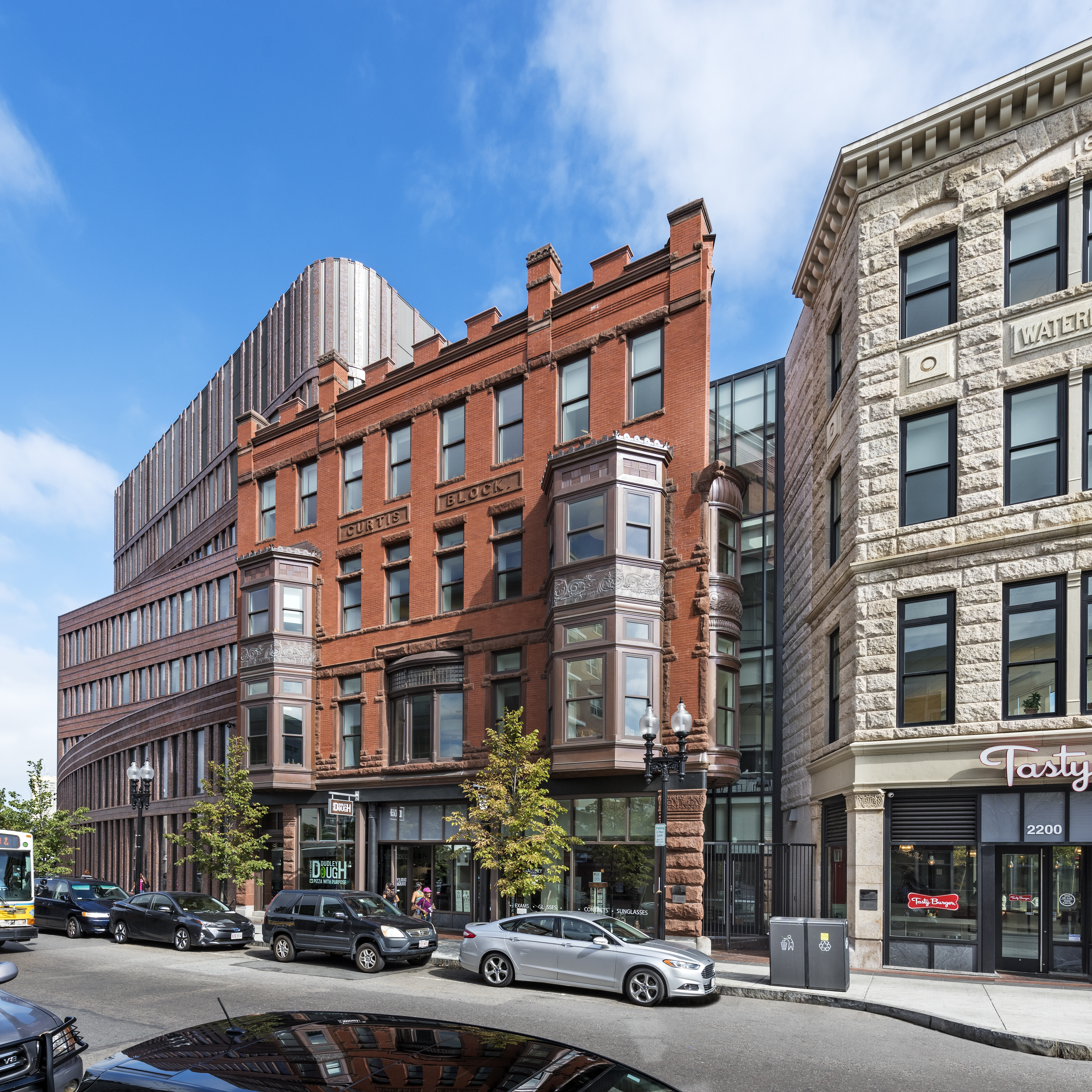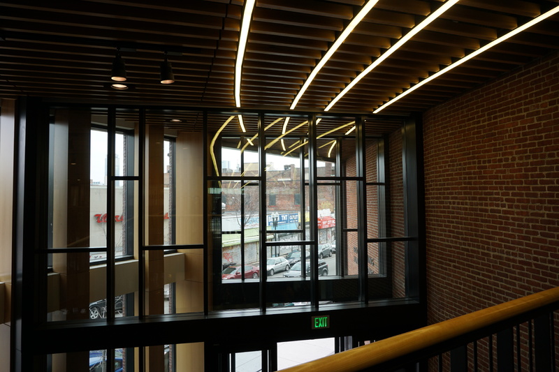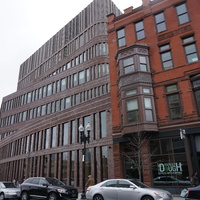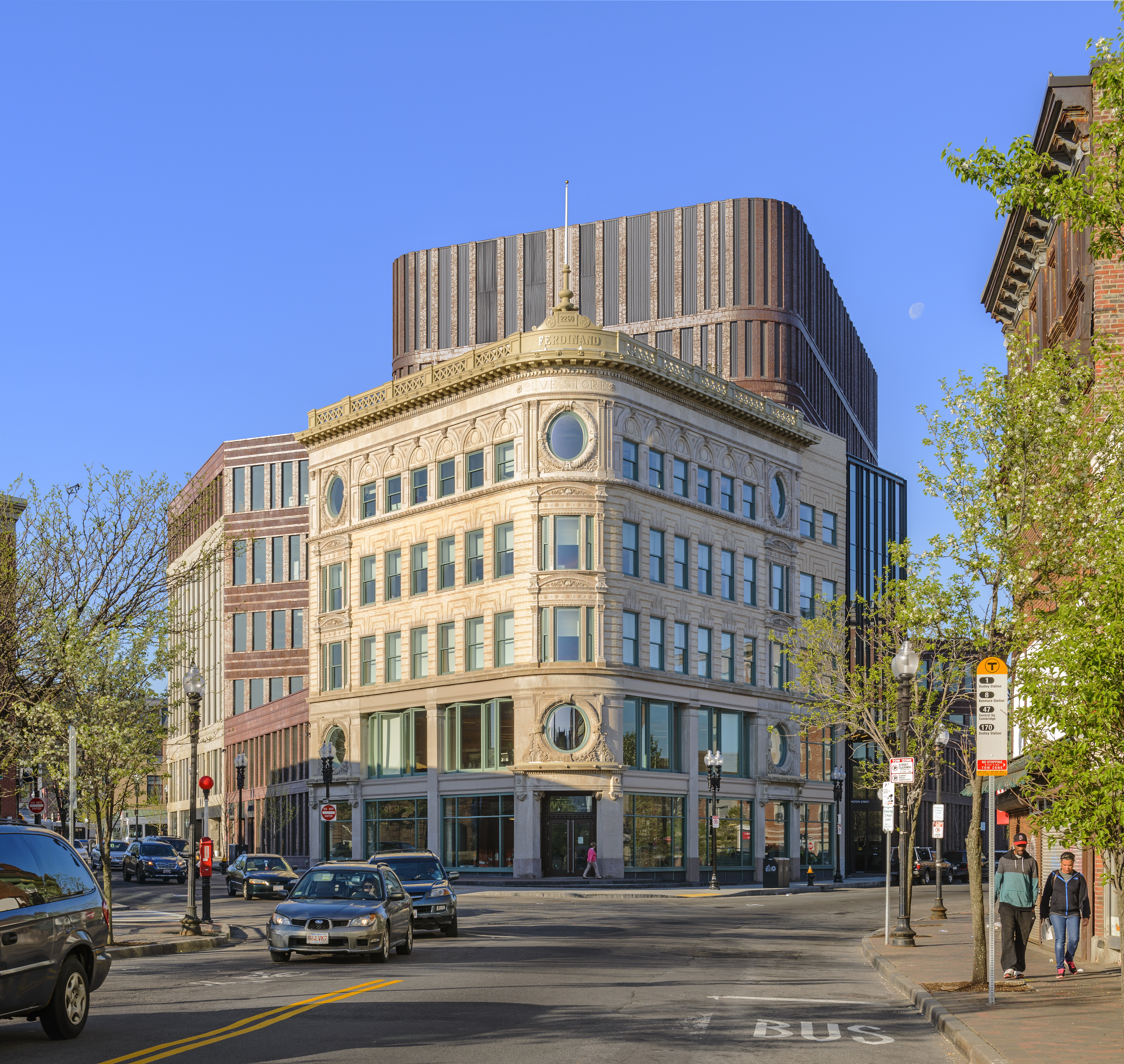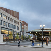 The 215,000 square foot complex incorporates the restoration of three historic facades, including the landmark Ferdinand building, coupled with new construction and capped with a green roof. The interior includes a light filled-atrium, offices, community meeting space, and first floor retail.